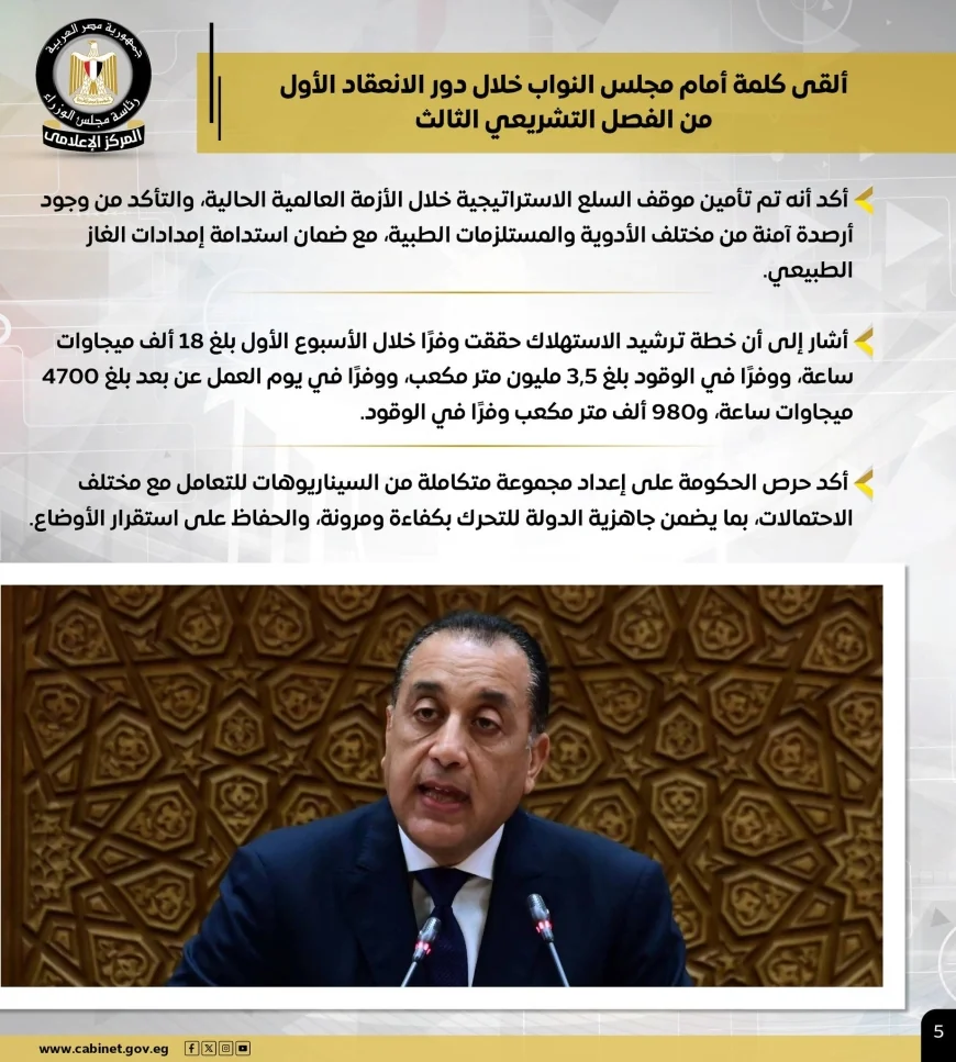 وفي كلمته أمام مجلس النواب المصري، أكد رئيس الوزراء أن خطة ترشيد استهلاك الكهرباء حققت وفرًا بلغ 18 ألف ميجاوات ساعة خلال أسبوع واحد.