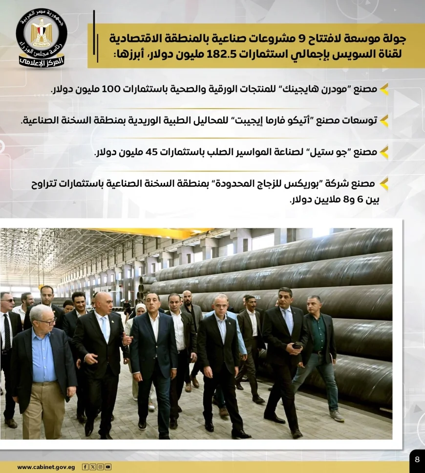 كما افتتح رئيس الوزراء 9 مشروعات صناعية باستثمارات بلغت 182.5 مليون دولار، خلال جولته في المنطقة الاقتصادية لقناة السويس.