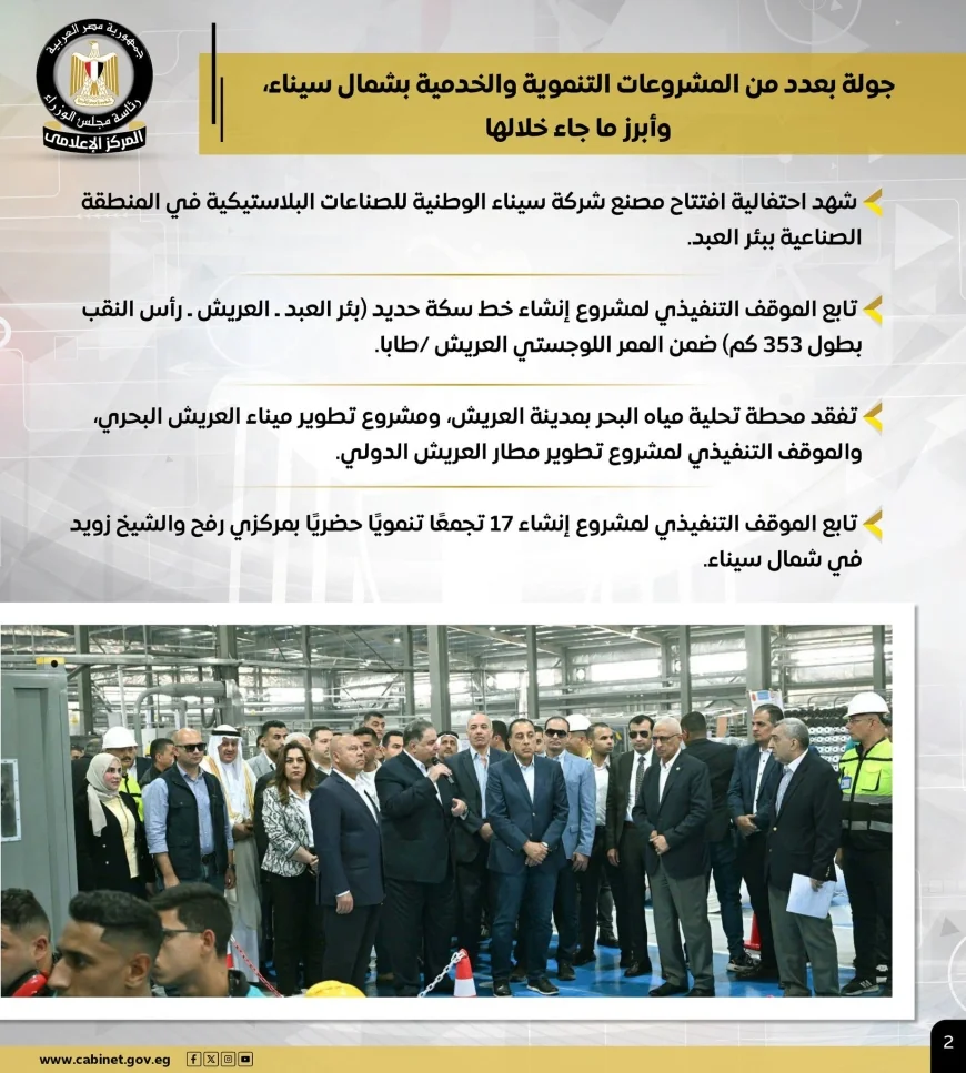 وفي إطار دعم جهود التنمية، أجرى رئيس الوزراء جولة موسعة في شمال سيناء، شملت متابعة وافتتاح عدد من المشروعات التنموية والخدمية.