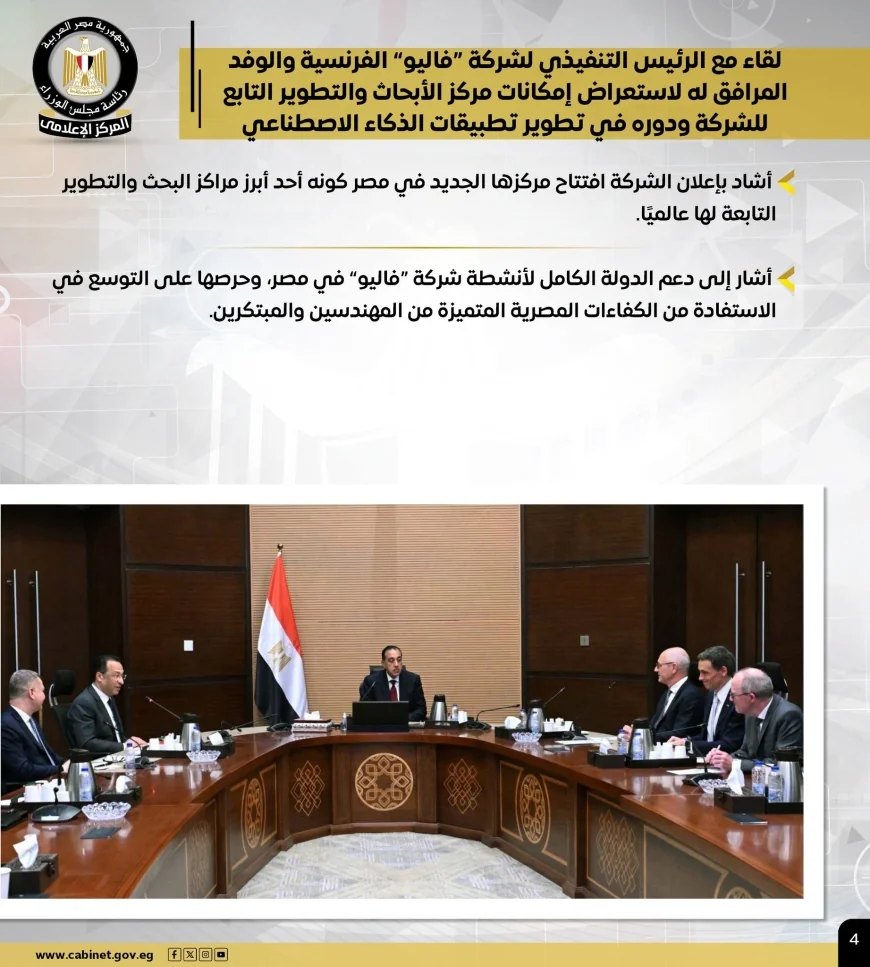 خلال لقائه مع الرئيس التنفيذي لشركة فاليو، أشاد رئيس الوزراء بإعلان الشركة افتتاح مركز جديد لتطوير تطبيقات الذكاء الاصطناعي في مصر.