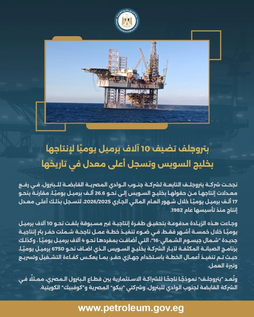 نجحت شركة بتروجلف التابعة لـجنوب الوادي المصرية القابضة للبترول في رفع إنتاجها من حقول خليج السويس إلى نحو 26.6 ألف برميل يوميًا، مقارنة بنحو 17 ألف برميل خلال العام المالي 2025/2026، لتسجل بذلك أعلى معدل إنتاج منذ تأسيسها عام 1982.