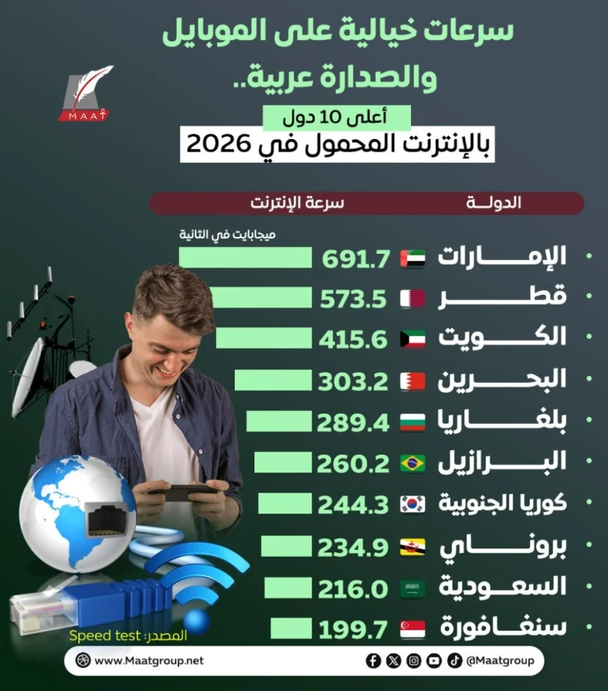 شهد عام 2026 قفزة نوعية في سرعات الإنترنت عبر الهاتف المحمول على مستوى العالم، مع تصدر عدد من الدول العربية والخليجية المراكز الأولى عالميًا، في مؤشر واضح على تسارع وتيرة التحول الرقمي وتطور البنية التحتية التكنولوجية في المنطقة.