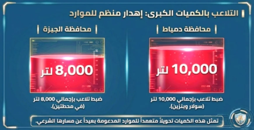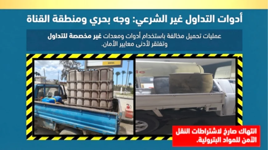 وفي محافظة السويس، تمكنت الحملات من ضبط عملية تحميل غير شرعي لكمية بلغت 2500 لتر باستخدام سيارة صهريجية، في مخالفة واضحة لضوابط تداول المنتجات.