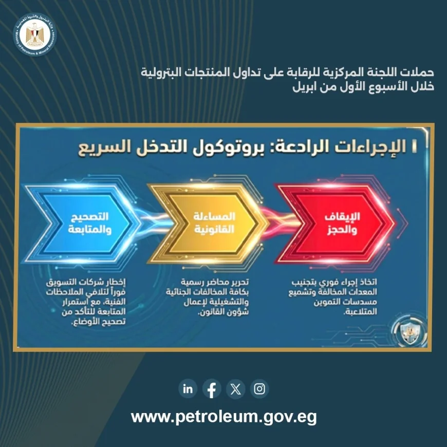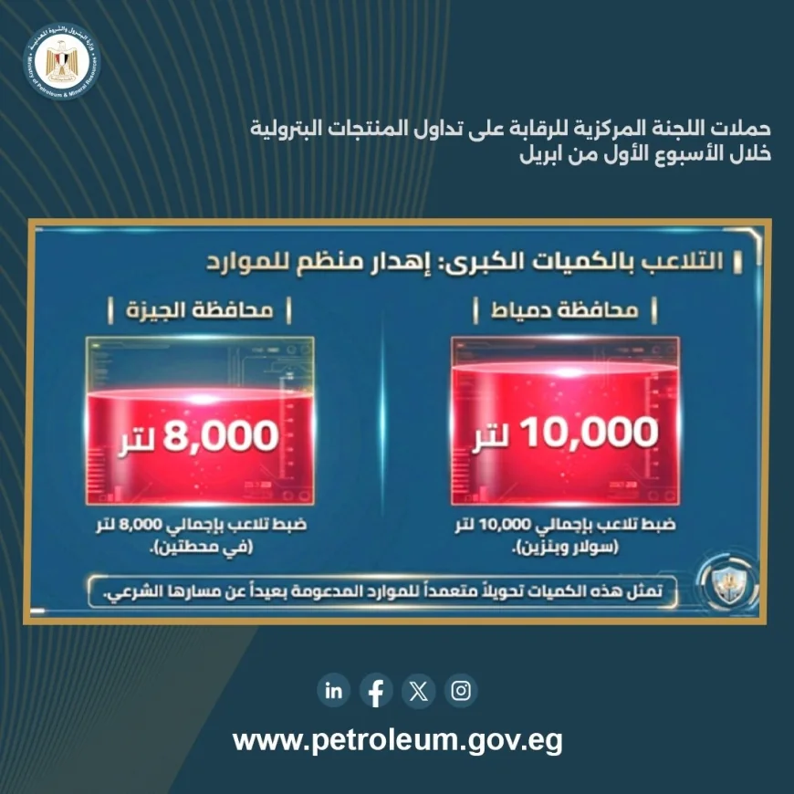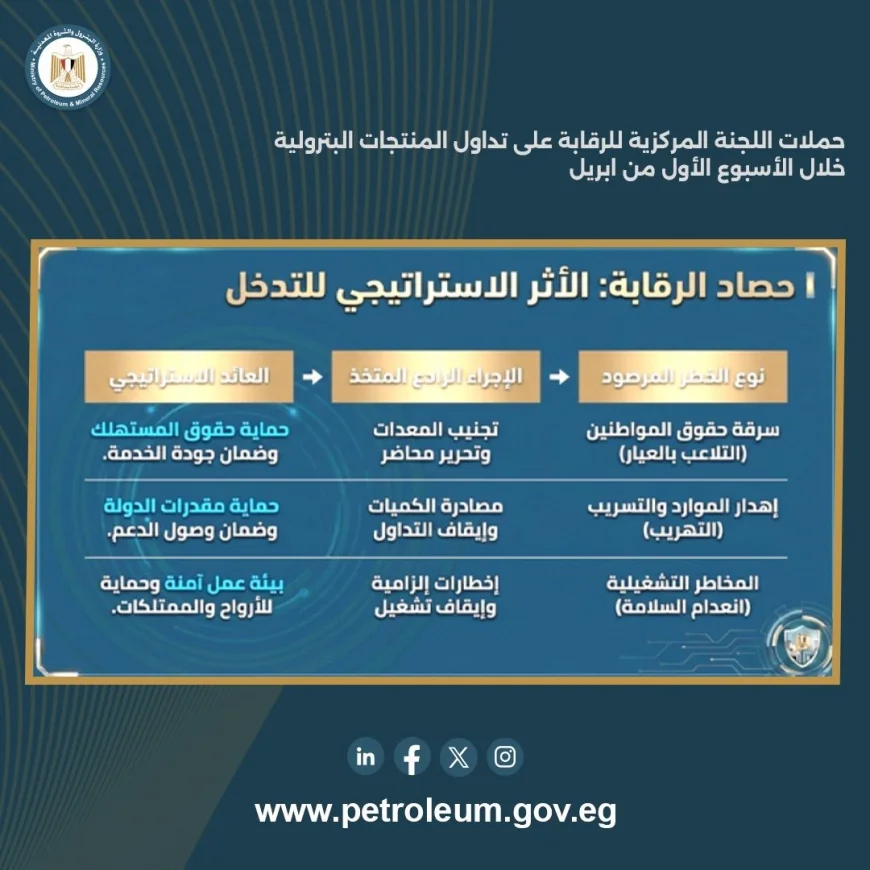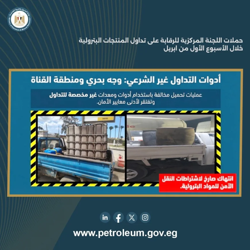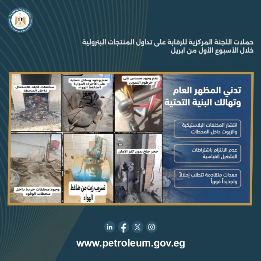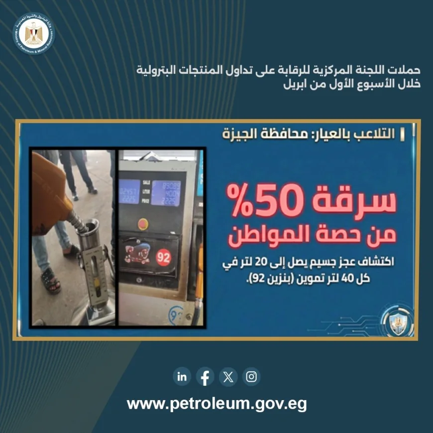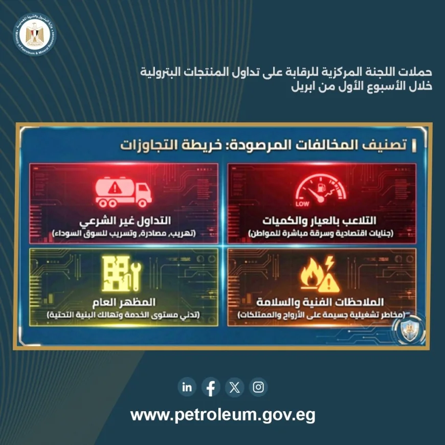 أعلنت الهيئة المصرية العامة للبترول مواصلة الحملات المفاجئة للجنة المركزية للرقابة على تداول وتوزيع المنتجات البترولية خلال الأسبوع الأول من أبريل، وذلك لضمان الالتزام بالضوابط ومنع أي تلاعب أو تهريب. وشملت الحملات المرور على 120 محطة وقود مفاجئًا، بالإضافة إلى تخصيص فرق رقابية ثابتة داخل 540 محطة وتغطية 27 محافظة رقابيًا بشكل شامل.