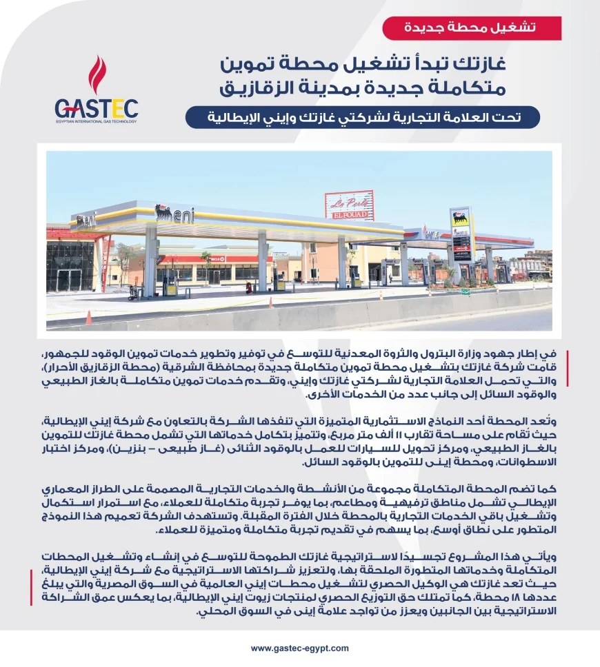 تواصل غازتك تنفيذ خططها التوسعية لزيادة عدد المحطات على مستوى الجمهورية، بما يعزز دورها في تطوير قطاع الطاقة في مصر وخدمة قطاع النقل.