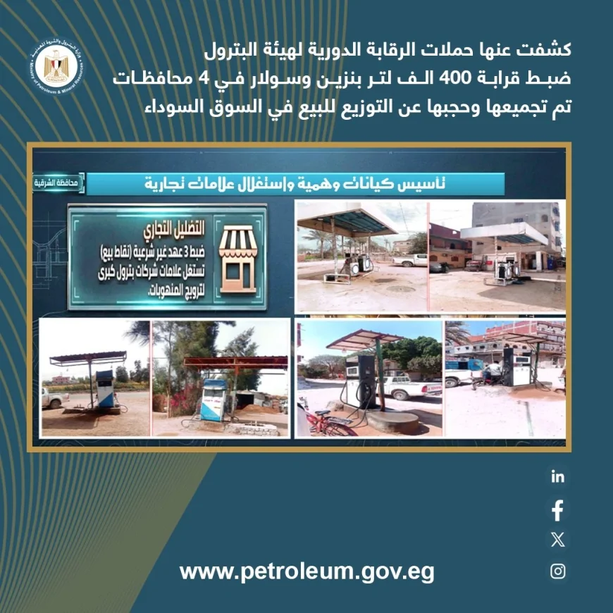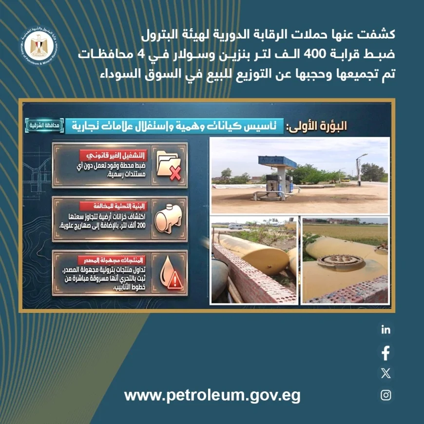كشفت الحملات أيضًا عن محطة غير مرخصة في محافظة الشرقية، تحتوي على خزانات أرضية بسعة تتجاوز 200 ألف لتر، بالإضافة إلى صهاريج علوية. وأظهرت التحريات استخدام هذه المنشأة في تداول منتجات بترولية مجهولة المصدر، يُشتبه في سرقتها من خطوط الأنابيب.