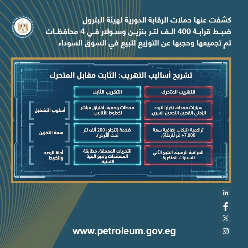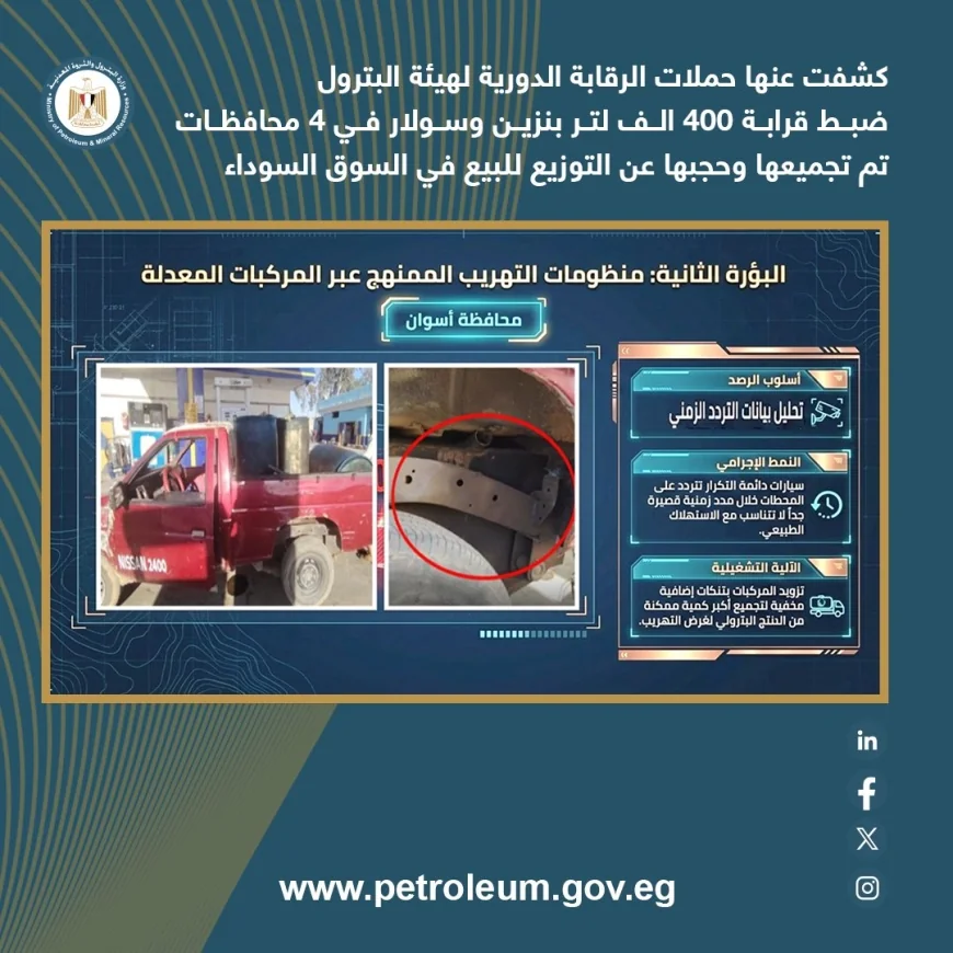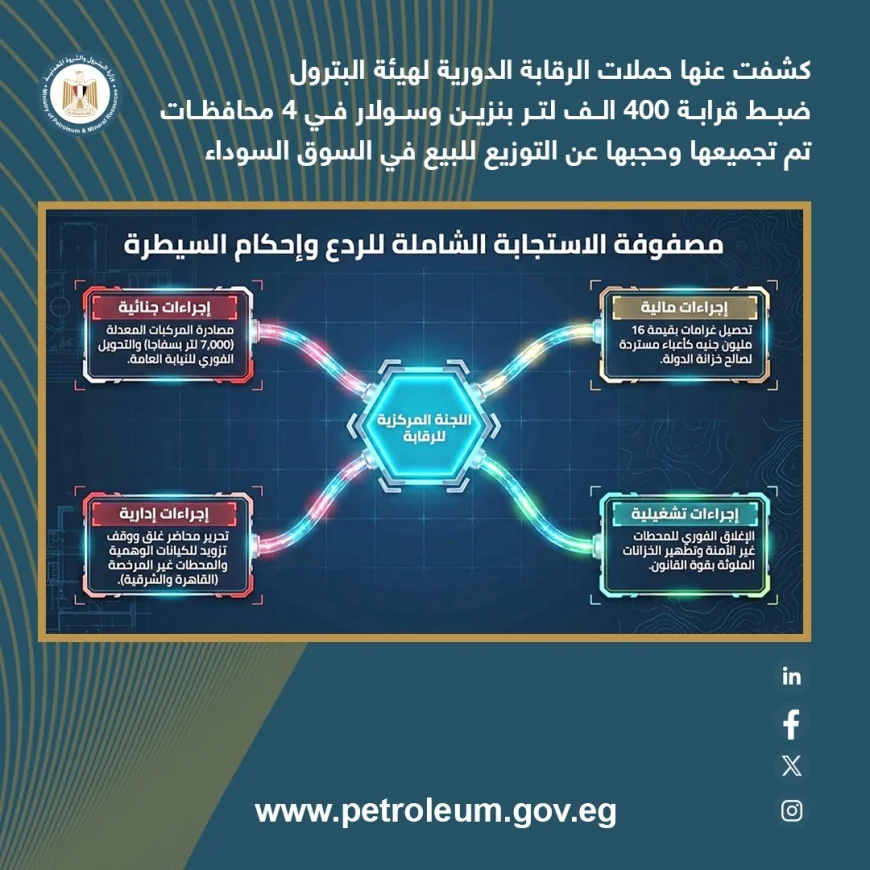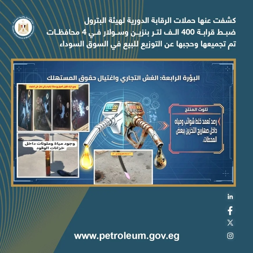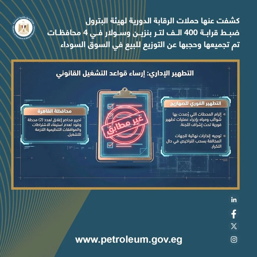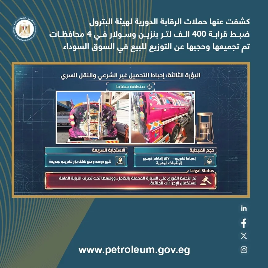 وأكدت الهيئة المصرية العامة للبترول استمرار تنفيذ حملات رقابية مفاجئة على مستوى الجمهورية، مع تشديد الرقابة على عمليات نقل وتداول المنتجات البترولية، واتخاذ إجراءات رادعة وفورية بحق المخالفين، لضمان استقرار السوق وعدم تكرار هذه التجاوزات.