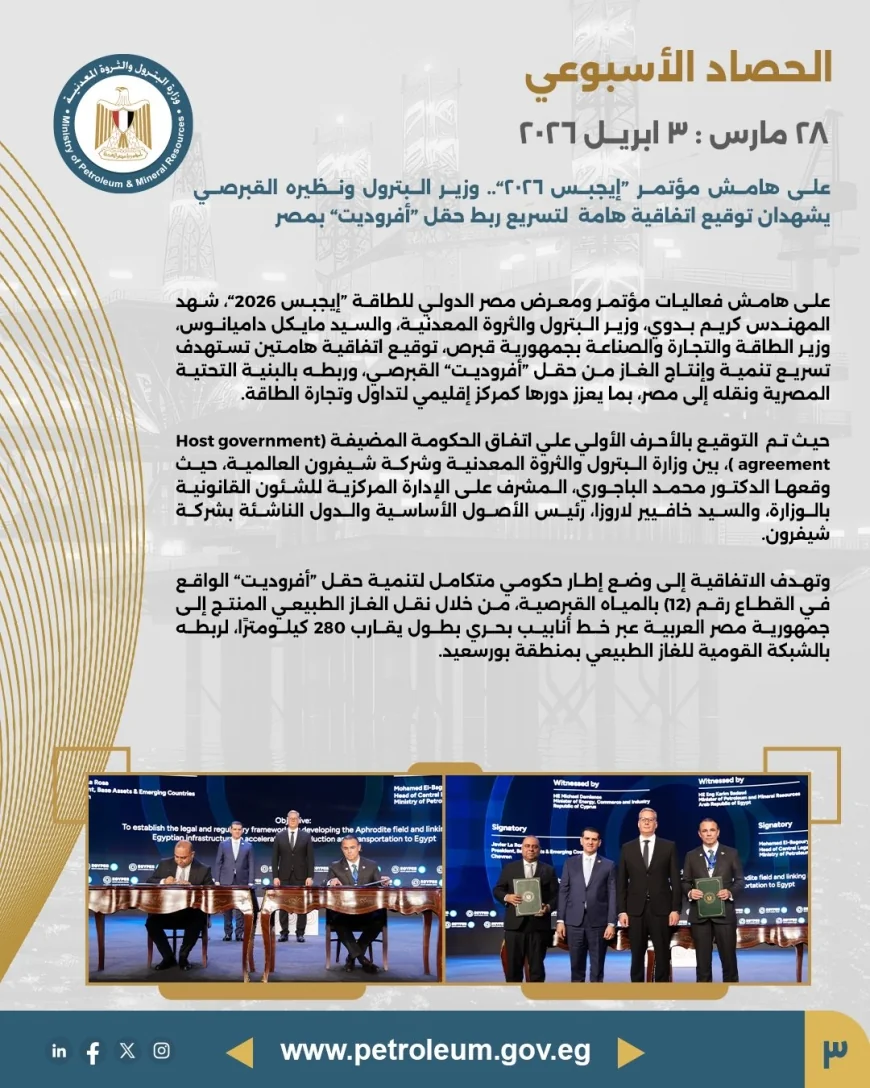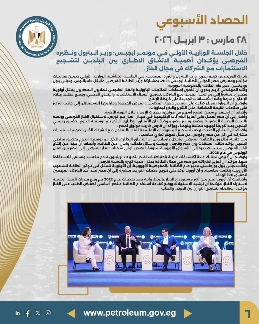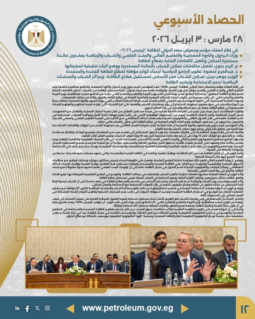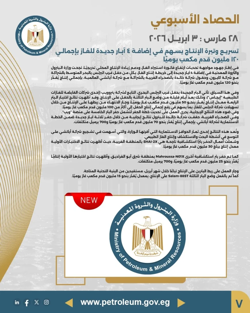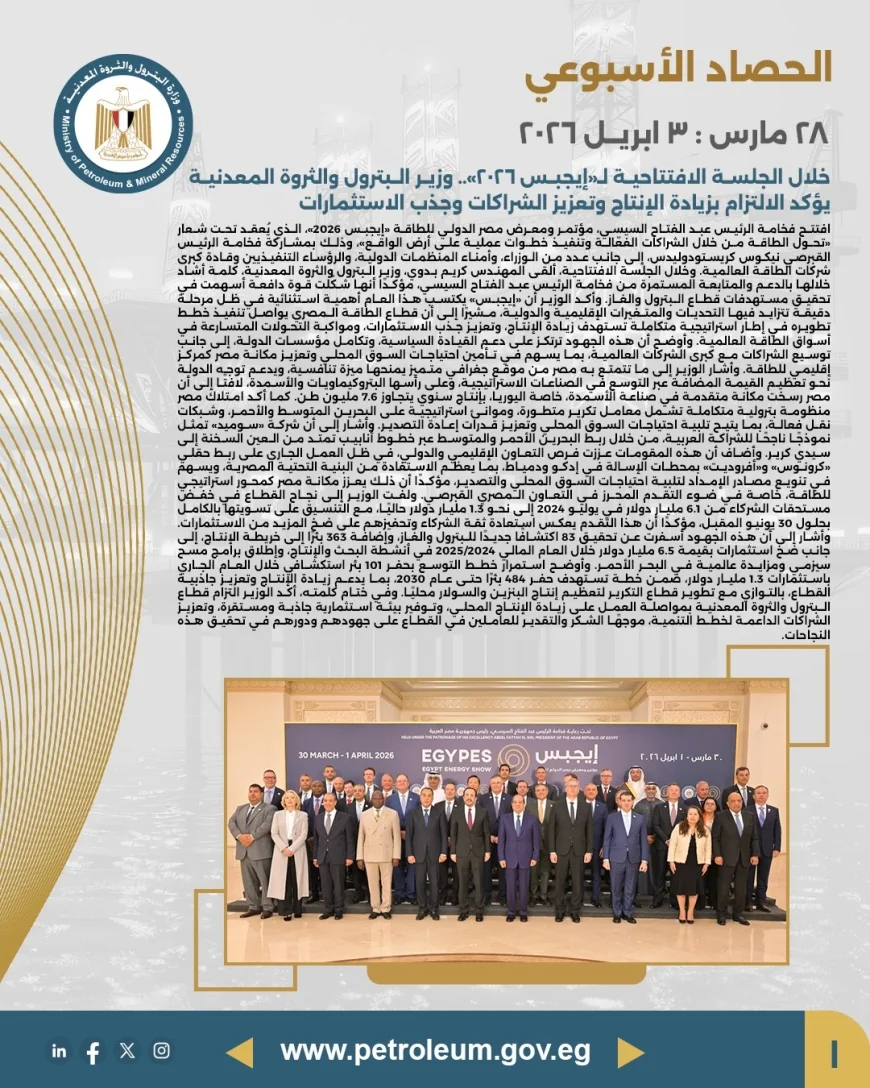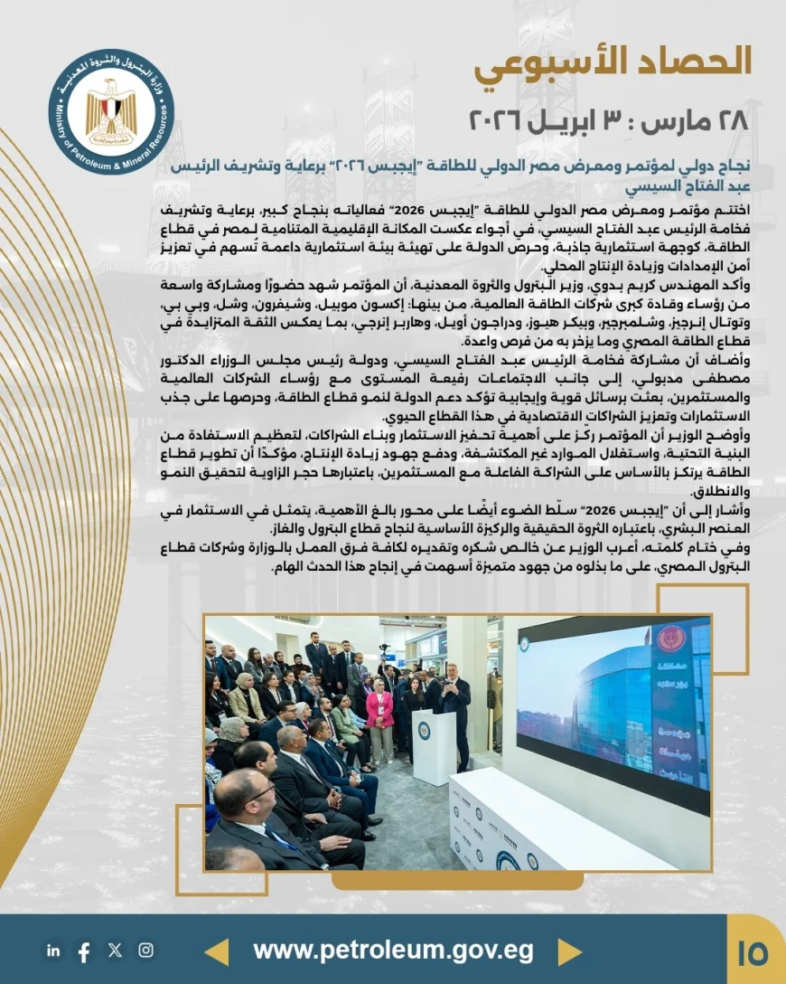يؤكد الحصاد الأسبوعي حرص وزارة البترول والثروة المعدنية على متابعة تنفيذ استراتيجية الوزارة على مستوى كافة القطاعات، وتقديم رؤية واضحة حول المشروعات الجارية، سواء في مجالات الاستكشاف، الإنتاج، أو تطوير البنية التحتية للطاقة، بما يسهم في استدامة النمو الاقتصادي وتعظيم العوائد الوطنية.