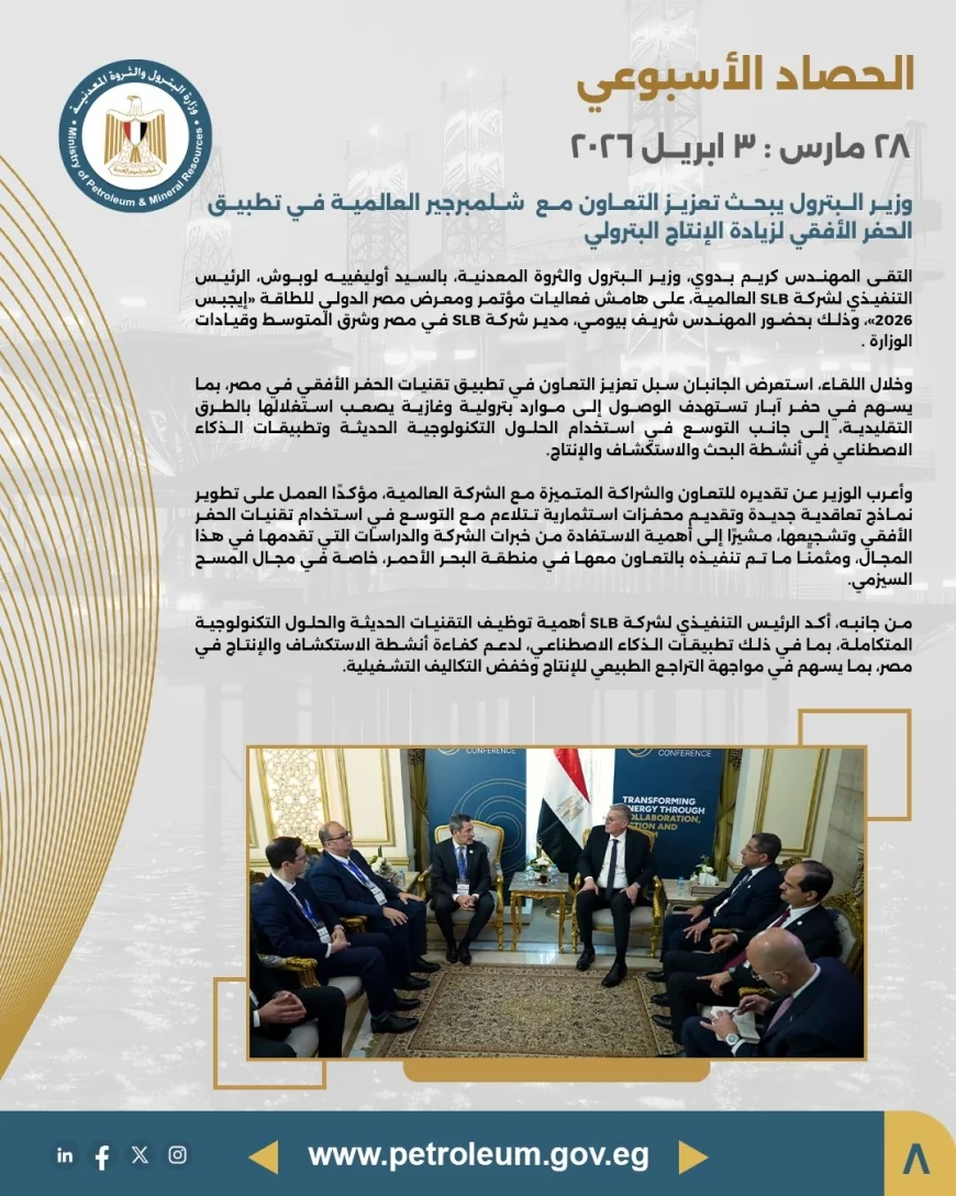 وزارة البترول تُصدر الحصاد الأسبوعي لأبرز أنشطتها ومتابعات وزير البترول كريم بدوي