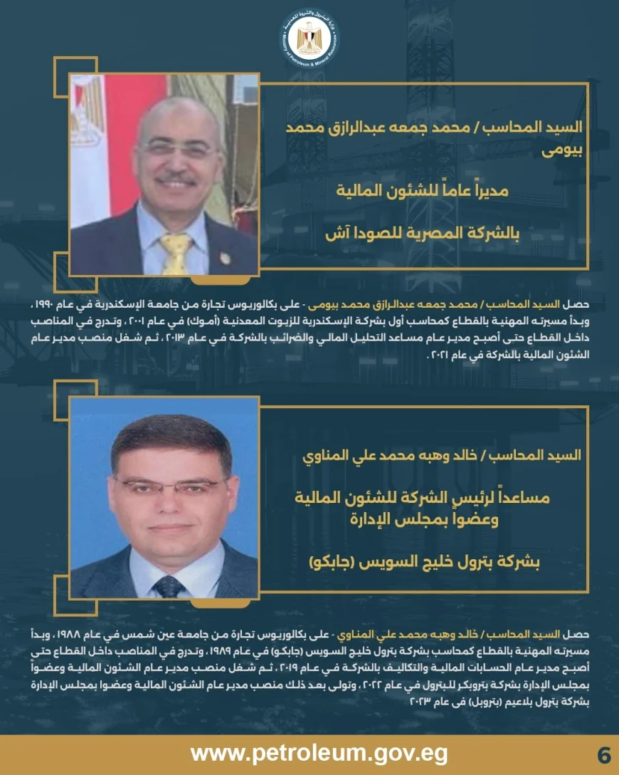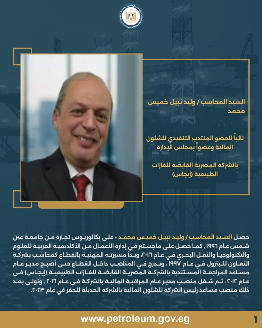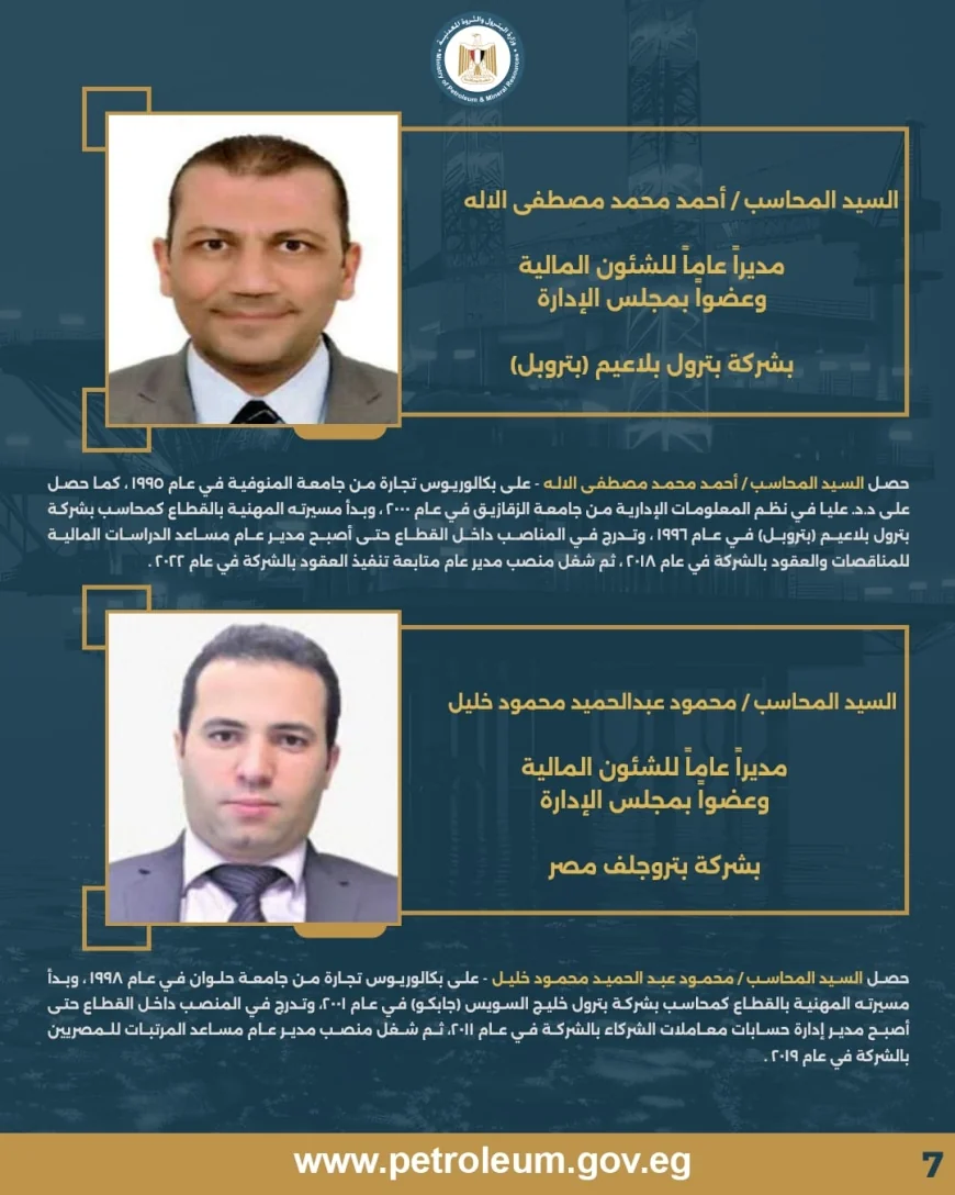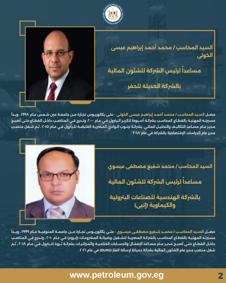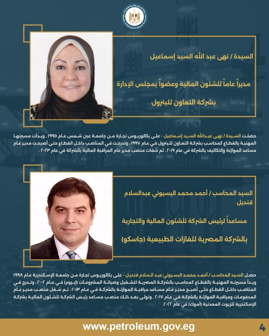 في إطار العمل على تطوير الأداء وضخ دماء جديدة في مواقع القيادة، أصدر المهندس كريم بدوي وزير البترول والثروة المعدنية حركة تنقلات بين قيادات الشئون المالية، شملت تعيين نائب للعضو المنتدب التنفيذي للشركة المصرية القابضة للغازات الطبيعية "إيجاس" للشئون المالية، إلى جانب تكليف مساعدي رؤساء الشركات ومديري عموم الشئون المالية في عدد من شركات قطاع البترول.