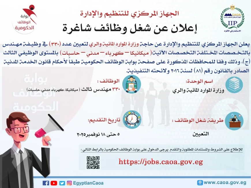 يُعلن الجهاز المركزي للتنظيم والإدارة، برئاسة المهندس حاتم نبيل، عن حاجة وزارة الموارد المائية والري لتعيين عدد (330) في وظيفة مهندس بالتخصصات الآتية:( ميكانيكا – كهرباء – مدني – حاسبات) بالمستوى الوظيفي الثالث (ج)، وذلك وفقا للمحافظات المذكورة على صفحة بوابة الوظائف الحكومية طبقاً لأحكام قانون الخدمة المدنية الصادر بالقانون رقم (81) لسنة 2016 ولائحته التنفيذية.